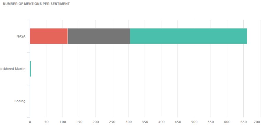 As seen in figure 11, NASA’s share of sentiment appears to be mostly positive with 356 positive mentions, followed by neutral at 190, and lastly negative at 115 mentions. Lockheed Martin has four total mentions and they are all positive.