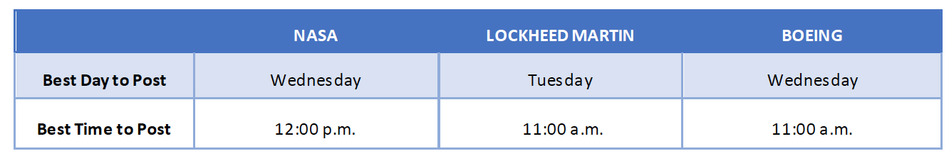 According to BuzzSomo, the best days/time for NASA, Lockheed Martin, and Boeing to post on Facebook are depicted in Figure 2 below.