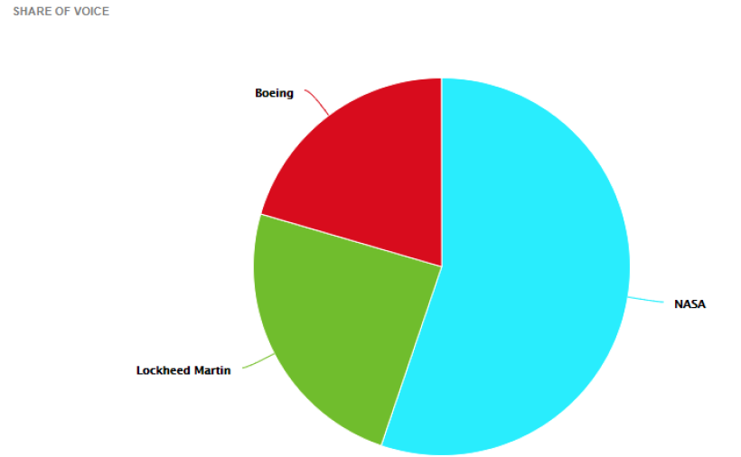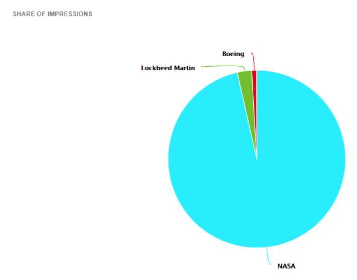 When analyzing share of voice, NASA has 55.2% share of voice followed by Lockheed Martin at 24.3% and Boeing with 20.5%. NASA also dominated in terms of share of impressions with 96.5% followed by Lockheed at 2.6% and Boeing with less than 1%.