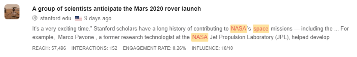 Several posts are in English and talk about what NASA’s building and the excitement surrounding launches and NASA as a space exploration agency (see figure 10 below). Some conversations surrounded NASA’s upcoming rover launch to Mars. These posts run the gamut of positive, neutral, and negative sentiment.