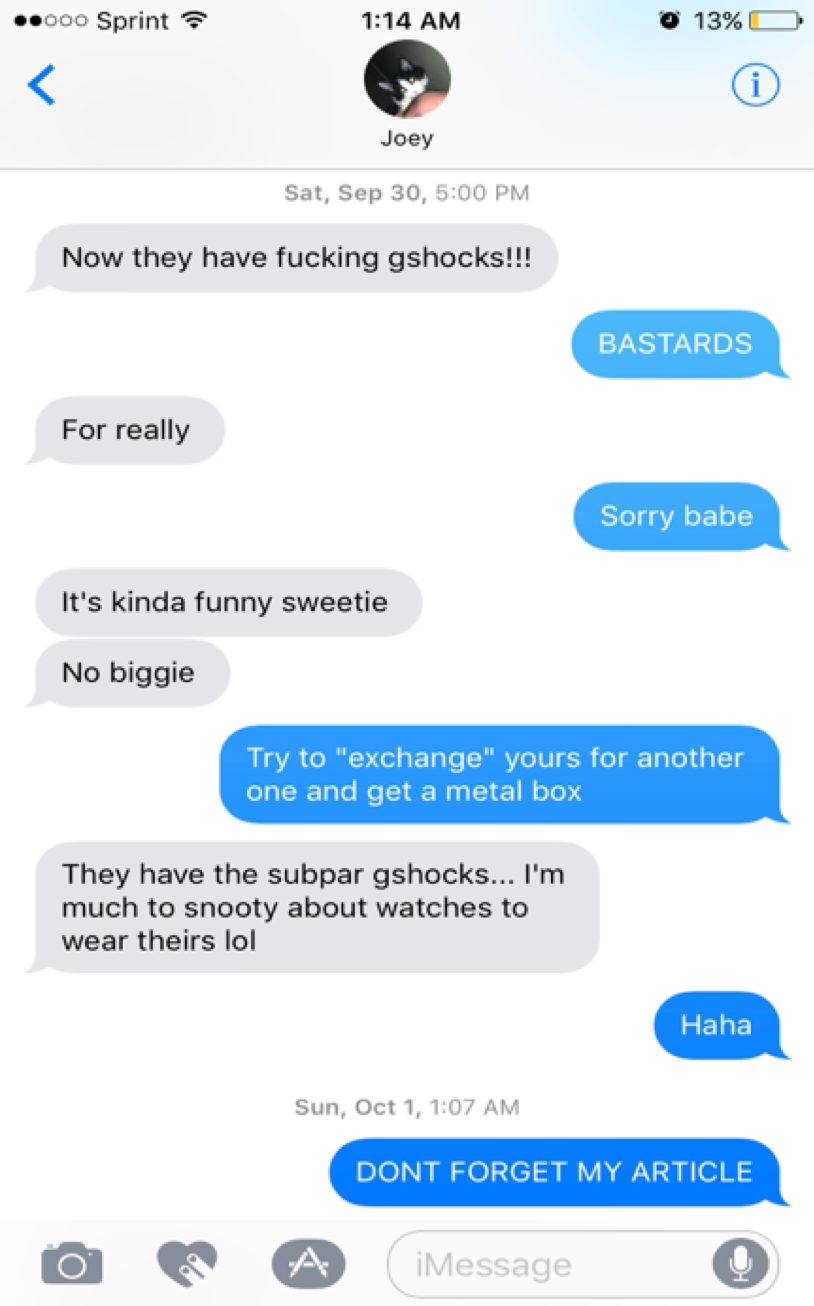 A few times during the course of the day of which this conversation spanned, the researcher reminded Joey to bring home her article that she left at work. One of these times she sent the reminder in all uppercase letters. This is a shortcut for conveying importance which is similar to bolding or italicizing on a word document, but fonts and design elements aren’t very customizable through cellphone text messaging except to uppercase certain words. Some phones may have a few other limited means of customizing the text appearance but the researcher’s iPhone did not. A case could be made that sending the same reminder multiple times is more or less effective than sending the reminder once in all capital letters.
